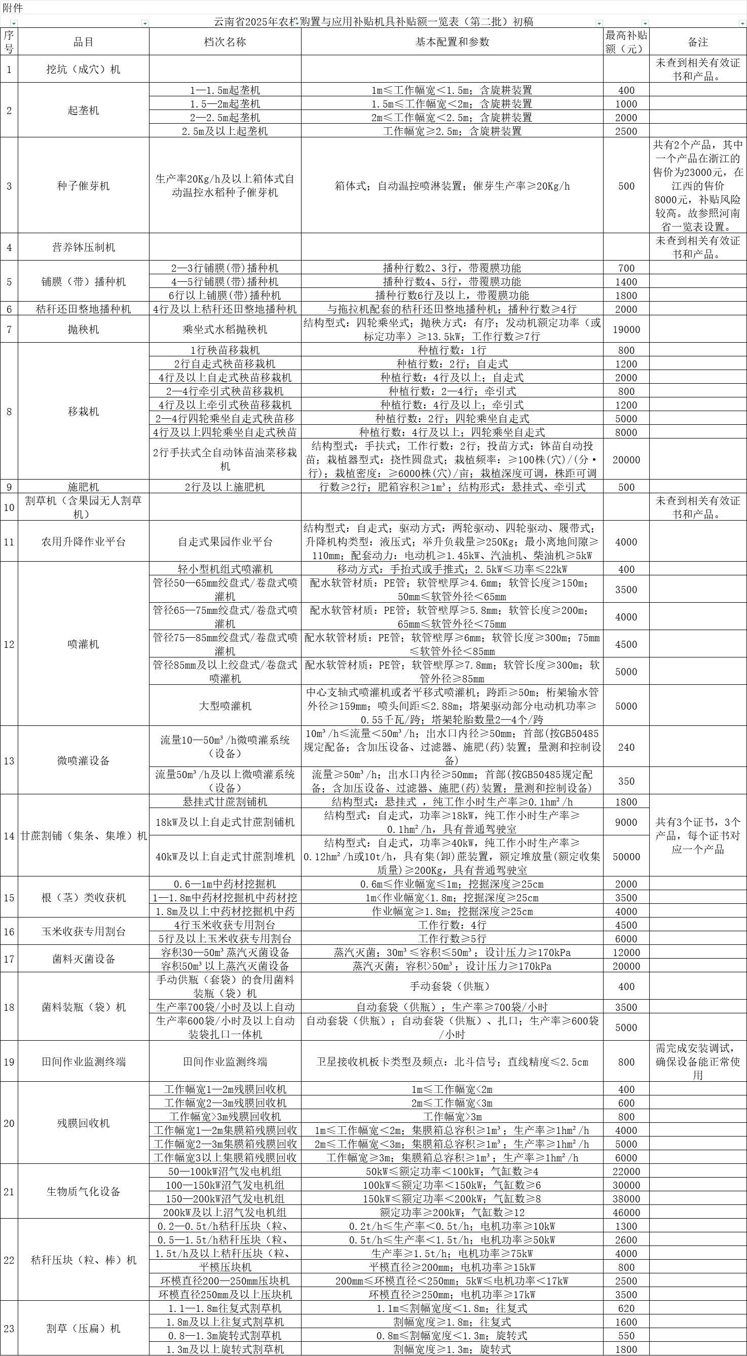 附件:云南省2025年农机购置与应用补贴机具补贴额一览表(第二批)初稿