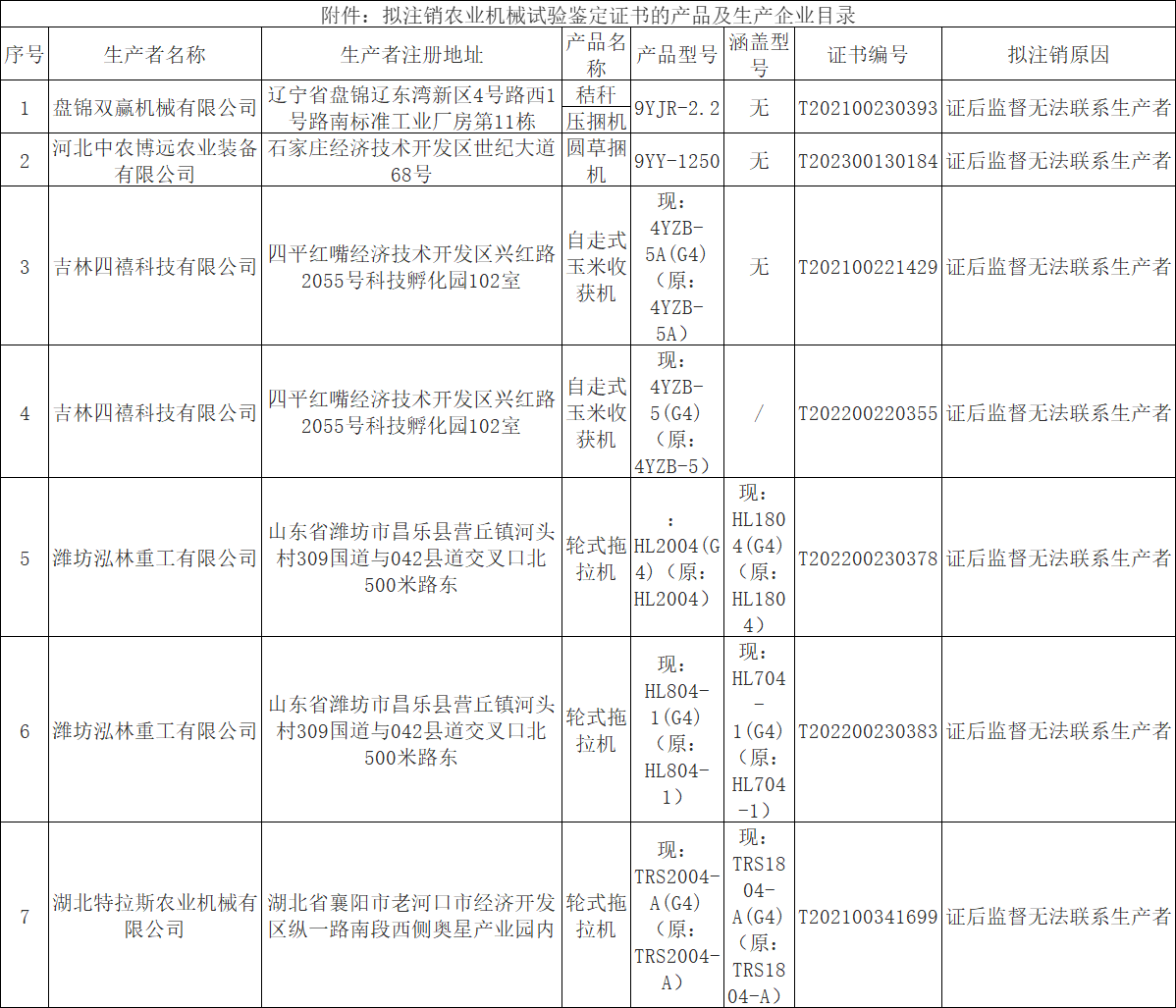 农机鉴〔2019〕54号)第四十四条规定,拟对盘锦双赢机械有限公司等5家企业的7张试验鉴定证书进行注销处理,现予以公示。