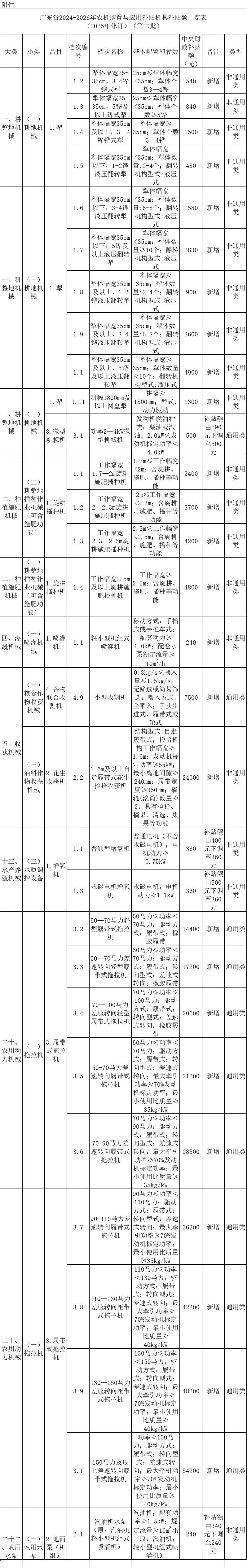 附件:广东省2024-2026年农机购置与应用补贴机具补贴额一览表(2025年修订)(第二批)